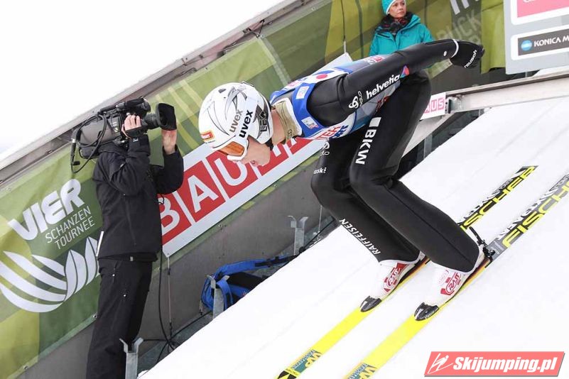 W pierwszej serii konkursowej Peter Prevc musiał zmagać się z jednymi z najgorszych warunków atmosferycznych w całej rundzie. Mimo to lider Turnieju Czterech Skoczni poszybował na odległość 125 metrów i pewnie objął prowadzenie w niedzielnych zawodach. Słoweniec miał 3,7 punktu przewagi nad drugim Norwegiem Kennethem Gangnesem (126,5 m). Trzeci ze stratą 5,7 punktu do Prevca był wicelider turnieju Severin Freund (122,5 m). Na kolejnych pozycjach sklasyfikowani byli Johann Andre Forfang (122 m), Andreas Wellinger (122,5 m) i Noriaki Kasai (124,5 m).