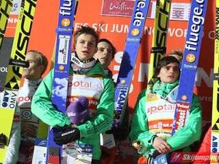Tuż za czołową trójką plasowali się Słoweńcy. Daleki lot na odległość 145,5 metra oddał 16-letni Domen Prevc. Zawiódł natomiast jego starszy brat, Peter, który wylądował na 124 metrze.