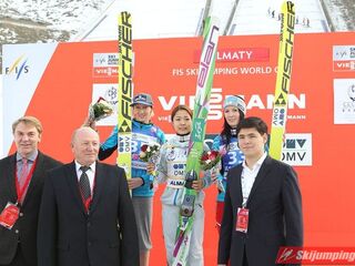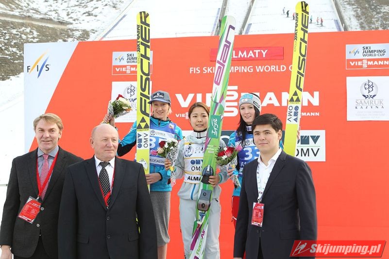 Zdobywczyni tegorocznego Pucharu Świata jako jedyna dwukrotnie przekroczyła granicę 100. metra. W pierwszej serii kończyła swoją próbę na 101. metrze, natomiast w finale poprawiła się o dwa metry, co od dziś jest oficjalnym rekordem kazachskiej skoczni, dla której był to debiut w zawodach najwyższej rangi. Na drugim stopniu podium stanęła Daniela Iraschko-Stolz (97 metrów i 100,5 metra), natomiast trzecią lokatę wywalczyła Jacqueline Seifriedsberger (98,5 metra i 99 metrów). Przewaga Takanashi nad Austriaczkami wyniosła kolejno 7,3 oraz 13,4 pkt.