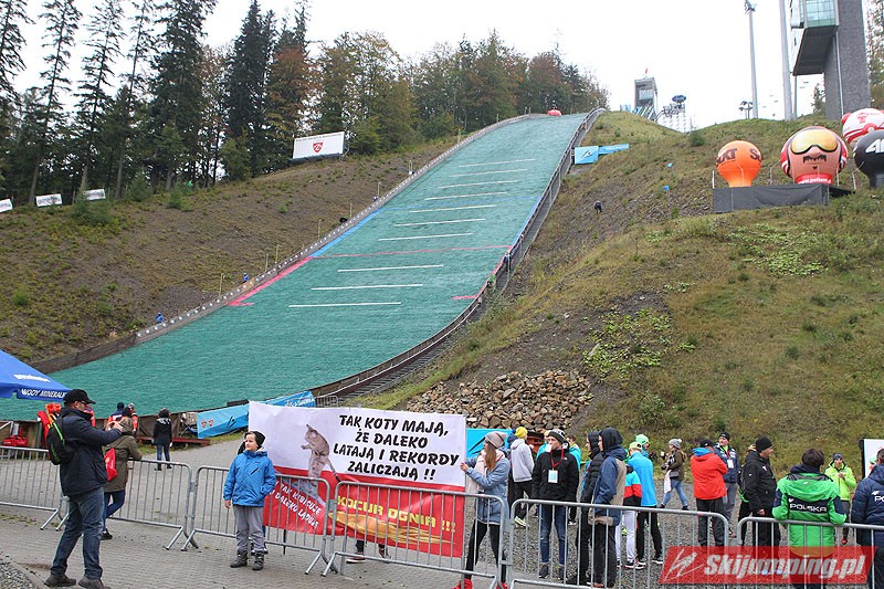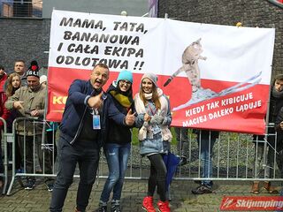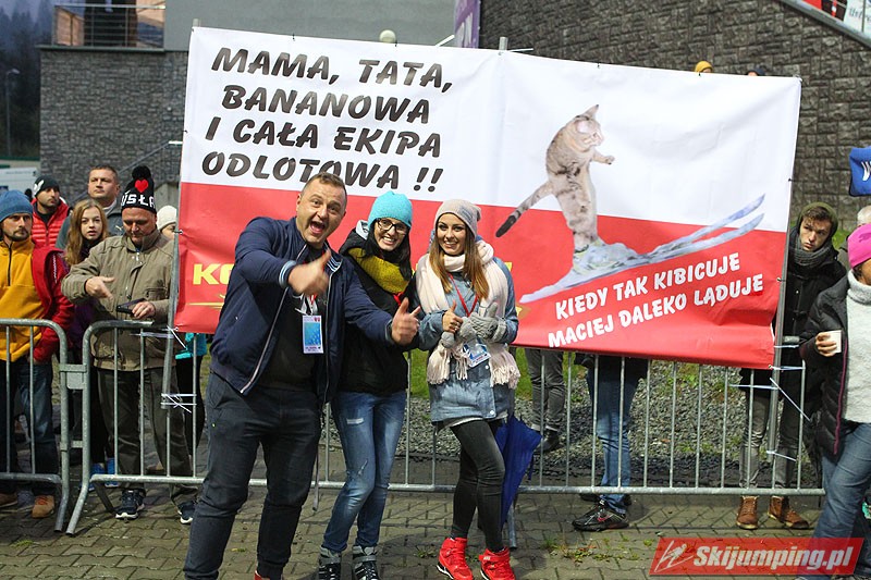 Zainteresowanie pod skocznią też jak widać niewielkie,duuużoo wolnych miejsc na trybunach (może pogoda też zrobiła swoje;).Tylko rodzina i znajomi nie zawiedli (fajny transparent dla M.Kota;) -