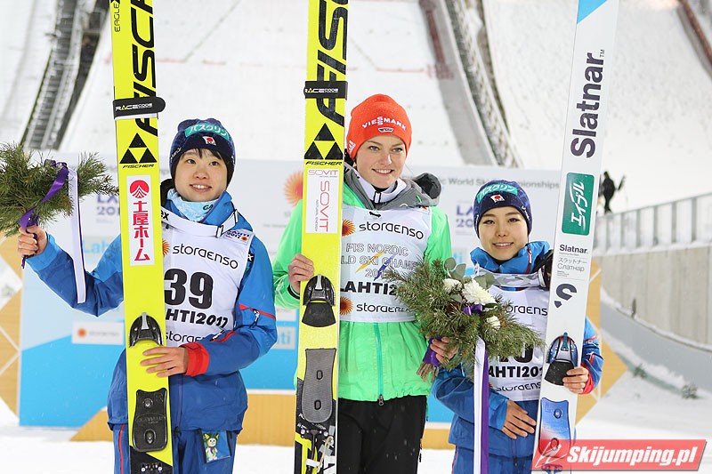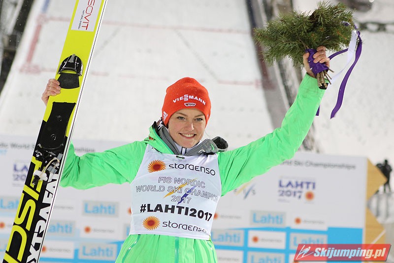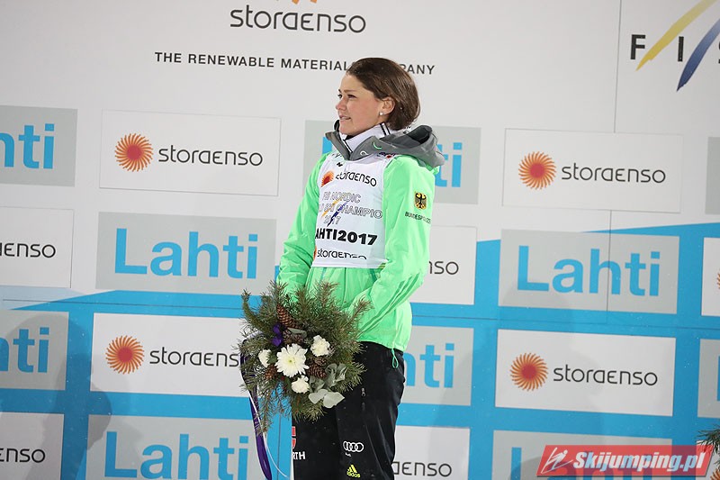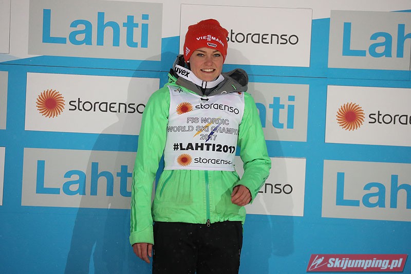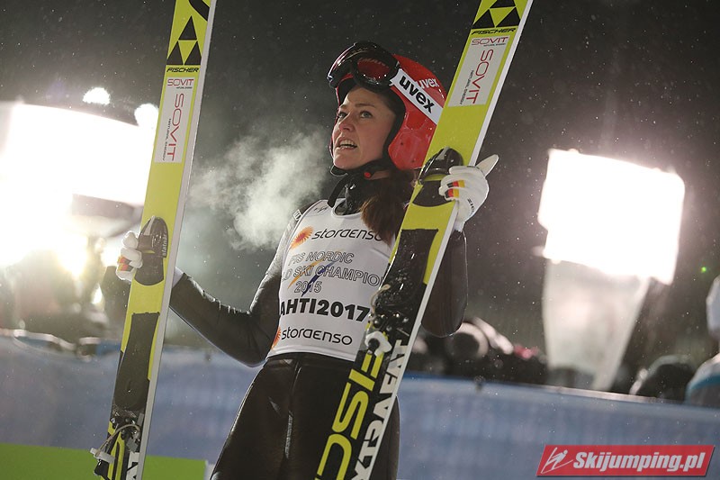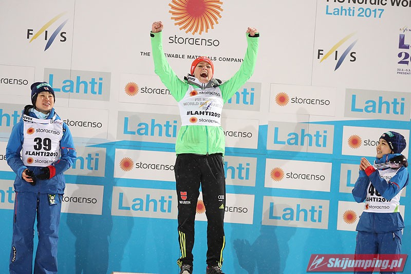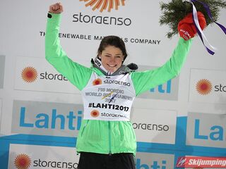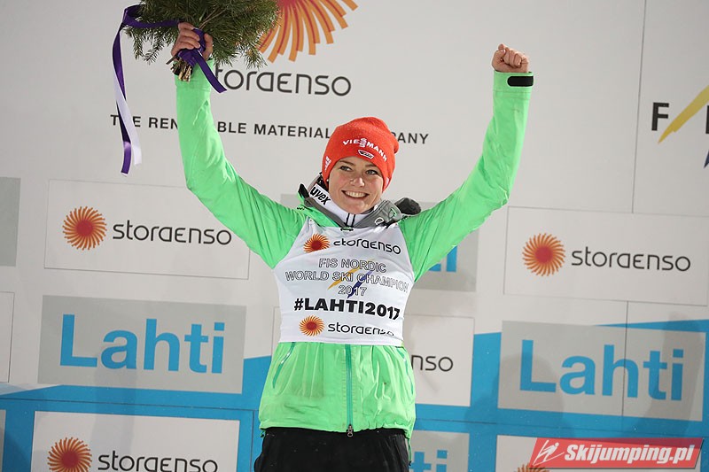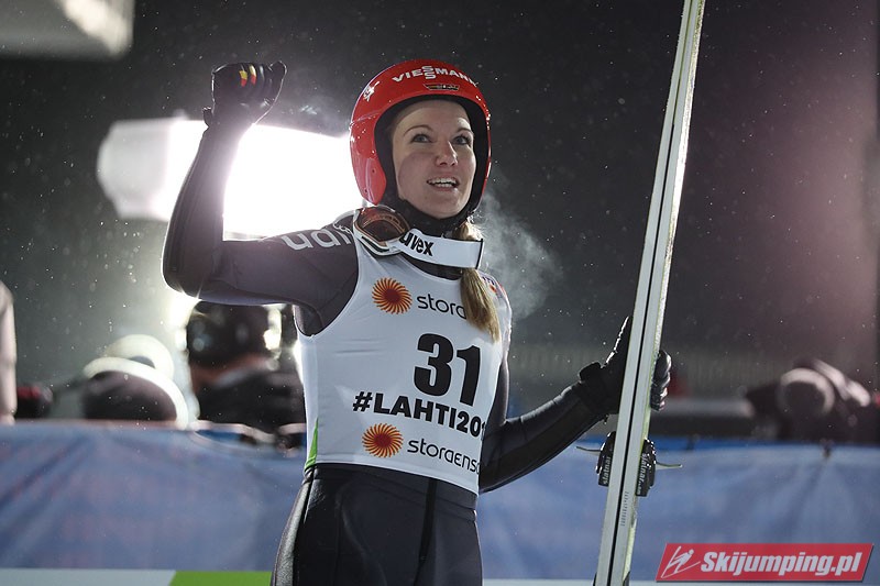 Carina Vogt mistrzynią świata! Reprezentantka Niemiec zwyciężyła w piątkowym konkursie w fińskim Lahti (HS100) i obroniła tytuł z Falun, tym samym zostając pierwszą w historii skoczkinią, która triumfowała na dwóch kolejnych czempionatach. Mistrzyni olimpijska sięgnęła po złoto dzięki skokom na odległość 98,5 m i 96,5 m. Srebro przypadło Yuki Ito, a brąz - Sarze Takanashi.