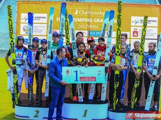 Reprezentacja Japonii odniosła trzecie w historii Letniego Grand Prix zwycięstwo w konkursie drużyn mieszanych. Azjatom na podium towarzyszyli Słoweńcy i Norwegowie, którzy na obiekcie Śnieżynka (HS140) wywalczyli kolejno drugą i trzecią lokatę. Rosjanom, którzy byli czwarci, na pocieszenie pozostaje fakt, iż nowym rekordzistą skoczni został Jewgienij Klimow. Lider klasyfikacji generalnej LGP w finale poszybował na 146. metr.
