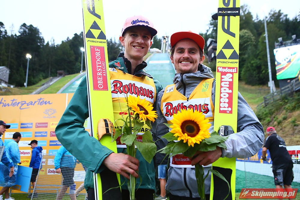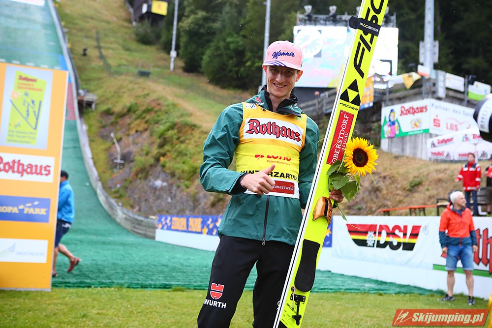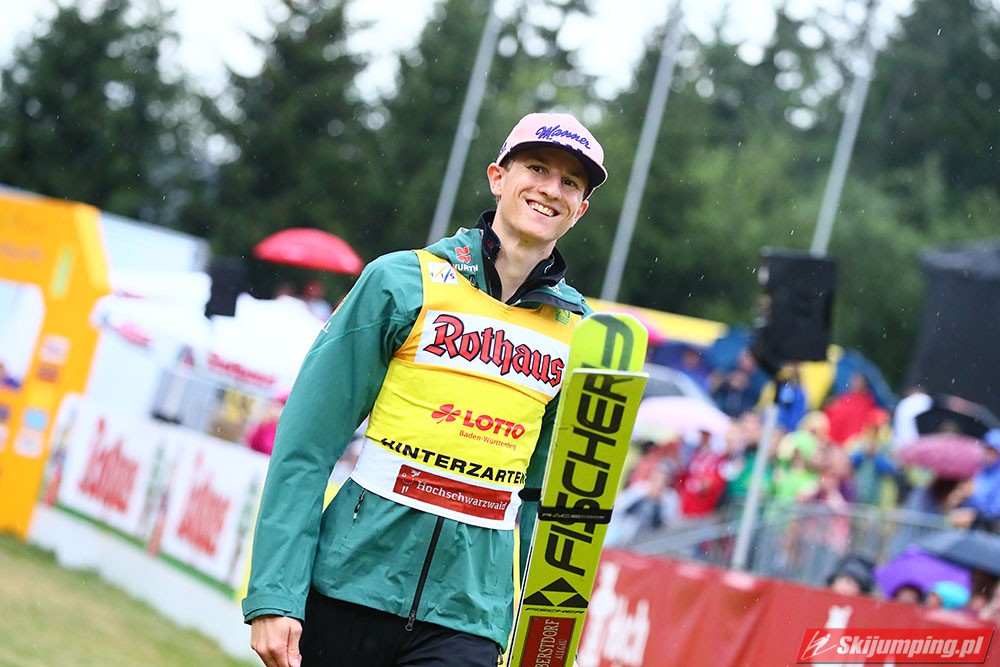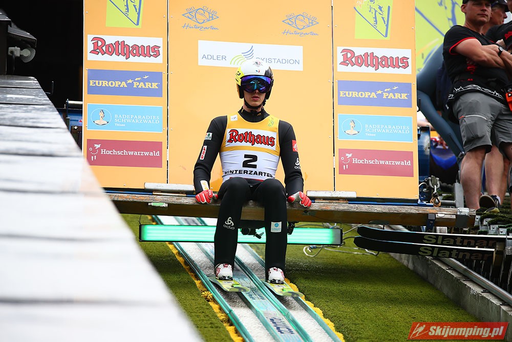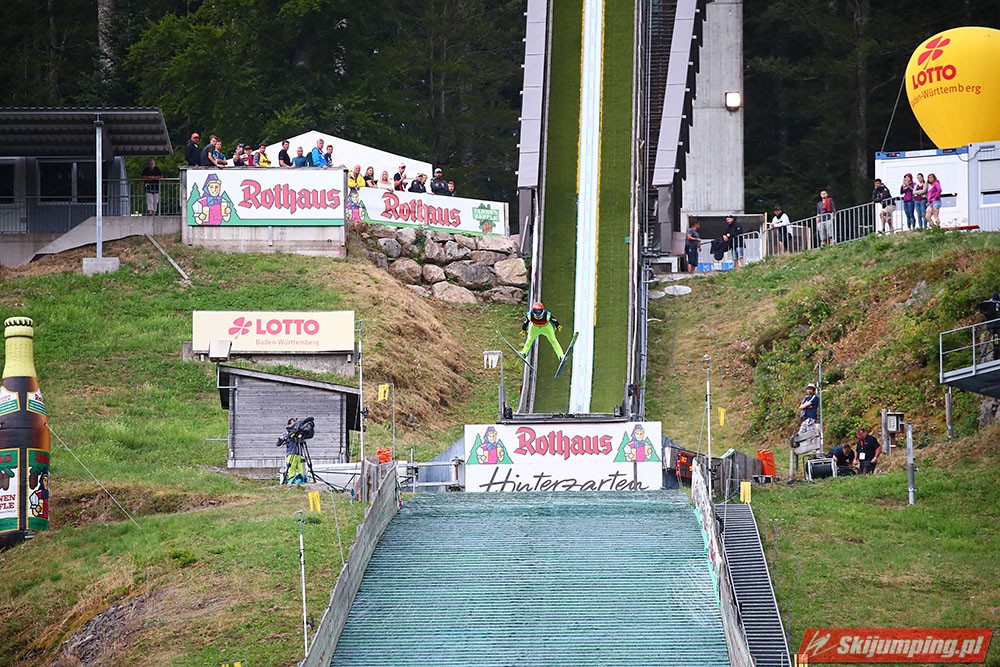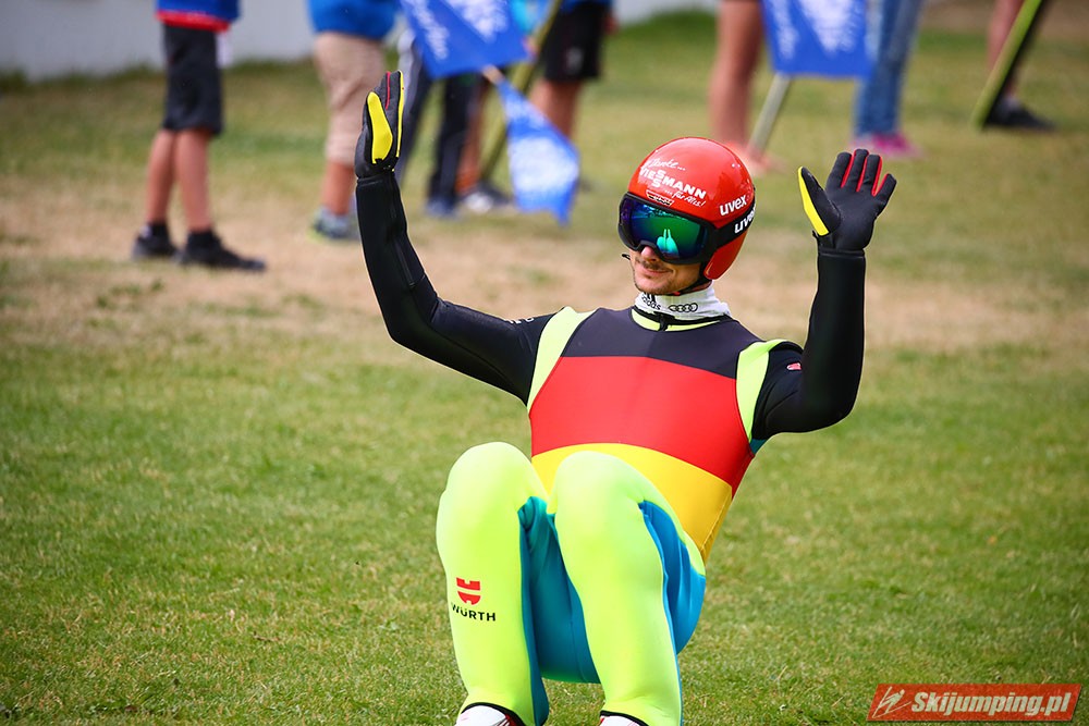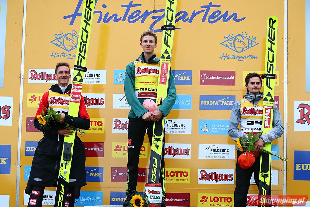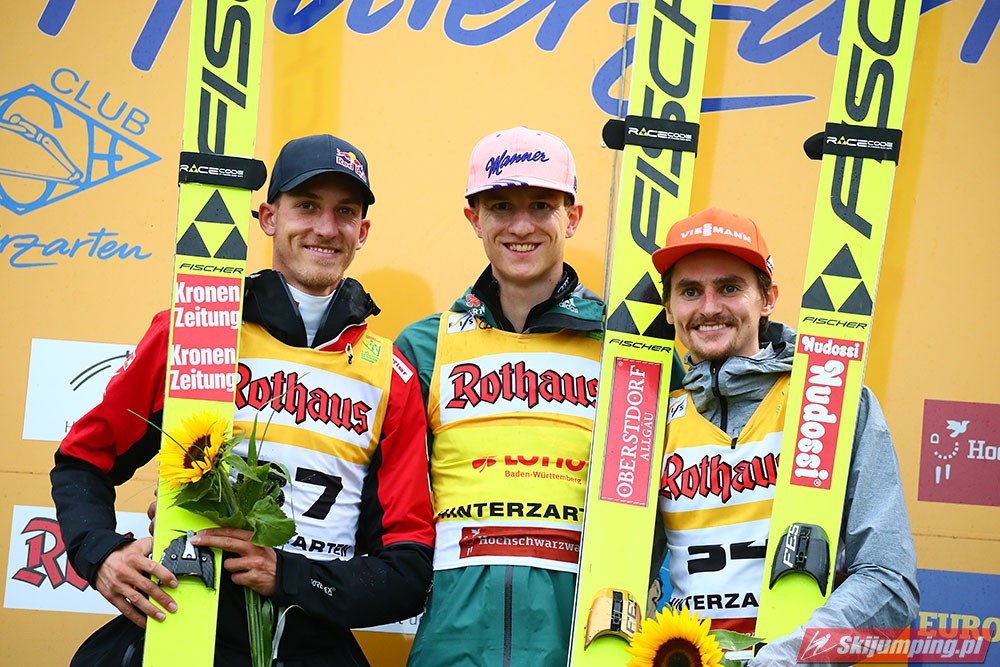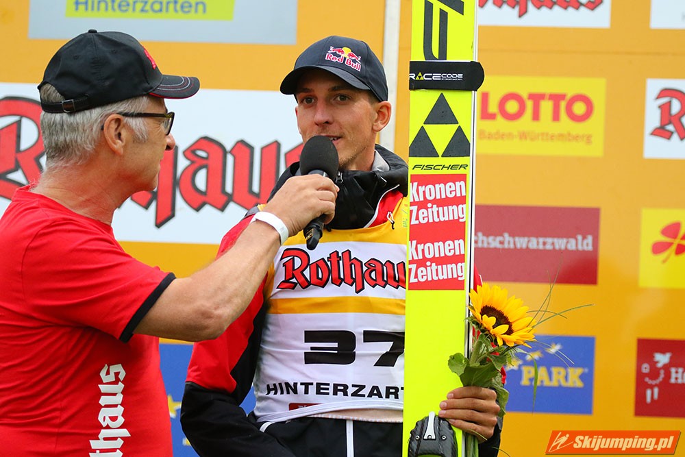 Karl Geiger został zwycięzcą konkursu indywidualnego Letniego Grand Prix na Rothaus-Schanze (HS108) w Hinterzarten. Reprezentant Niemiec oddał skoki na odległość 106 m oraz 99 m i wyprzedził o 0,4 punktu, prowadzącego na półmetku, Gregora Schlierenzauera. Na najniższym stopniu podium stanął kolejny zawodnik gospodarzy, Richard Freitag. W finale wystąpiło pięciu Polaków. Najwyższe miejsce zajął trzynasty Andrzej Stękała.