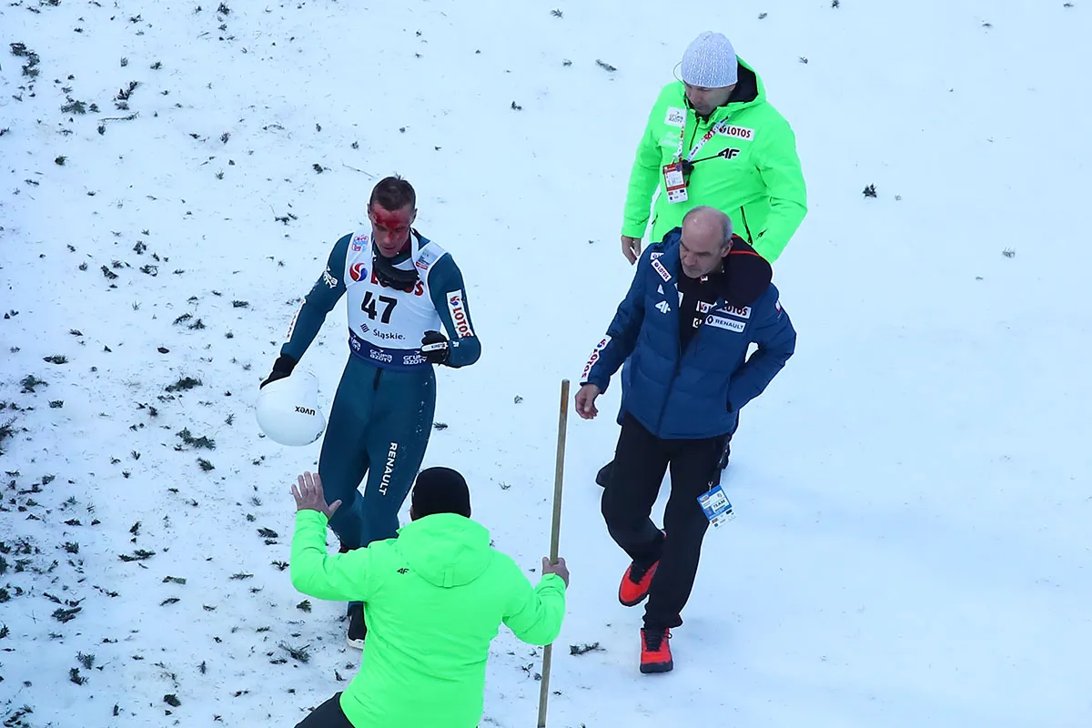 Uderzyła go w twarz narta, a nie uderzył głową w zeskok. Szansa więc na jakiś poważniejszy uraz głowy była mniejsza. Tym niemniej powinno się dmuchać na zimne w takich przypadkach.