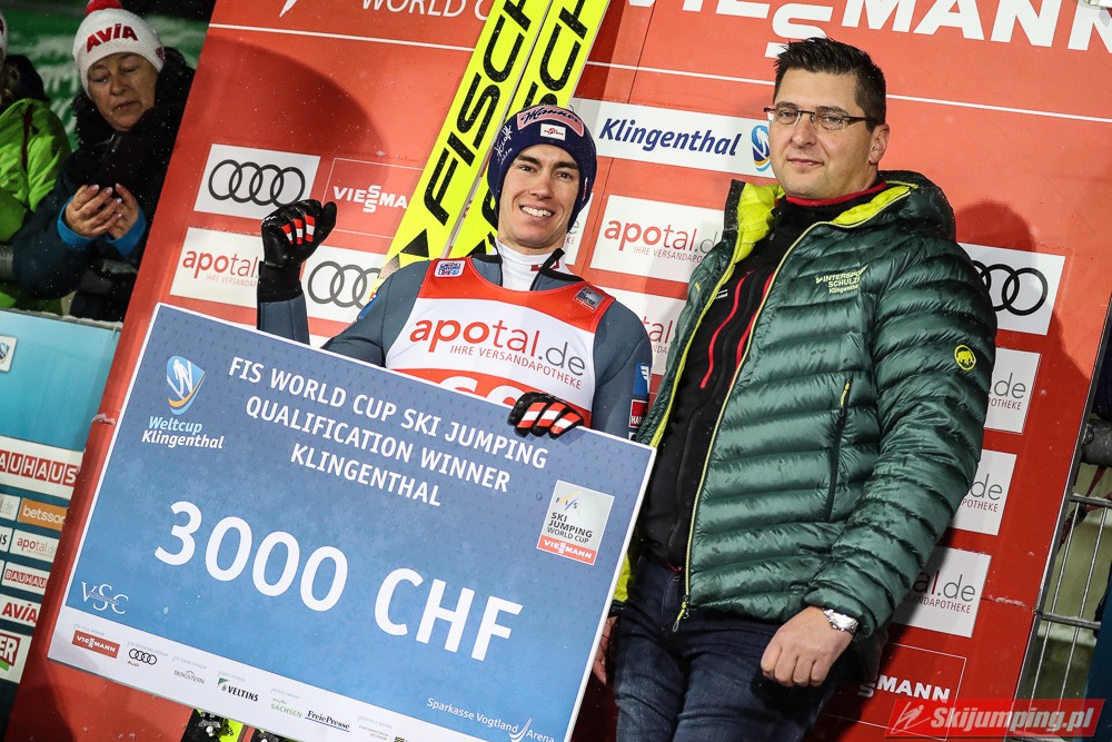 W wietrznych kwalifikacjach w Klingenthal najlepszy okazał się Stefan Kraft. Wicelider Pucharu Świata oddał skok na odległość 129,5 metra i wyprzedził o 0,6 punktu Karla Geigera (133 m). Trzecie miejsce zajął Piotr Żyła (135,5 m), który okazał się lepszy od Jewgienija Klimowa (134 m), Roberta Johanssona (133,5 m) oraz Ryoyu Kobayashiego (129 m).