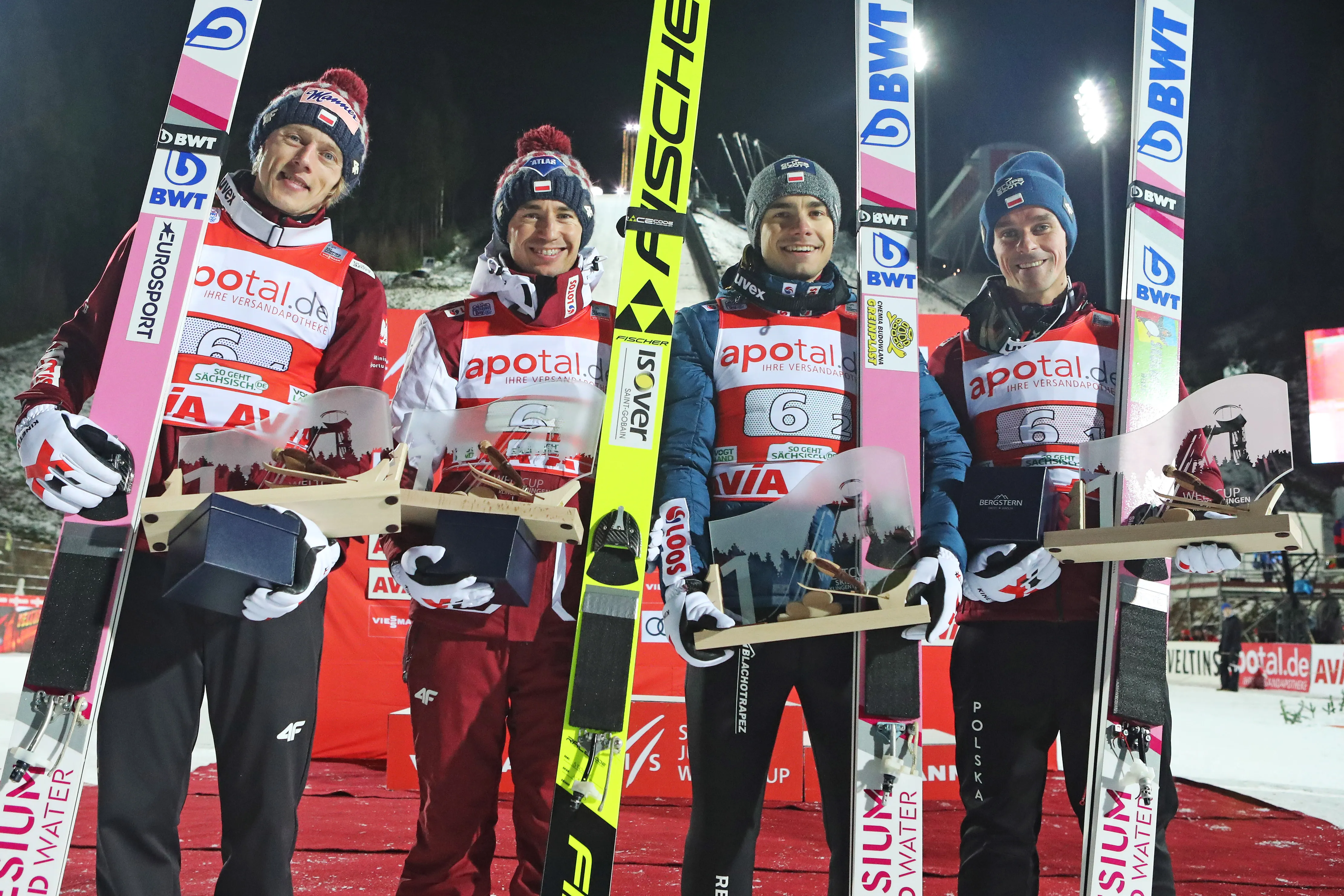 W sobotę wiatr jeszcze wyczyniał harce niziemskie a jury zmuszone do żonglowania belką dodało swoje do chaosu. W efekcie już po dwóch grupach skoczków różnice między drużynami przypominały rozmiarami takie, jakie zwykle widzimy po czterech. Sorry, taki mamy klimat, trzeba się do tego przyzwyczajać. Nam tym razem irytację szczęśliwie wybiła z głowy radość po zwycięstwie. Sorry, taką mamy psychologię. Jakby wygrała Słowenia, a my byśmy zajęli piąte miejsce, to wiekszość z nas by mówiła tylko o niesprawiedliwym wietrze, kabarecie w skokach i gitarze, którą trzeba rozbić na głowie Borka Sedlaka. A tak - można się było cieszyć. Tu ciekawostka - Polska wygrała w tym samym składzie, w jakim stawała na podium w Wiśle. Druga drużyna, która również stała na podium na inaugurację, została z kolei przemeblowana aż w połowie. Felder wyrzucił dwóch skoczków na "H" i wstawił trzeciego na "H" i jednego na "SZ". No, na "Sch", żeby być precyzyjnym. I tu pytanie - dlatego, że musiał, czy dlatego, że mógł? Michal Doležal nie za bardzo mógł, choć po kwalifikacjach pojawiły się pytania, czy Kuby nie powinien zastąpić Maćkiem. Ale w zwycięskim konkursie Kuba udowodnił, że nie powinien.