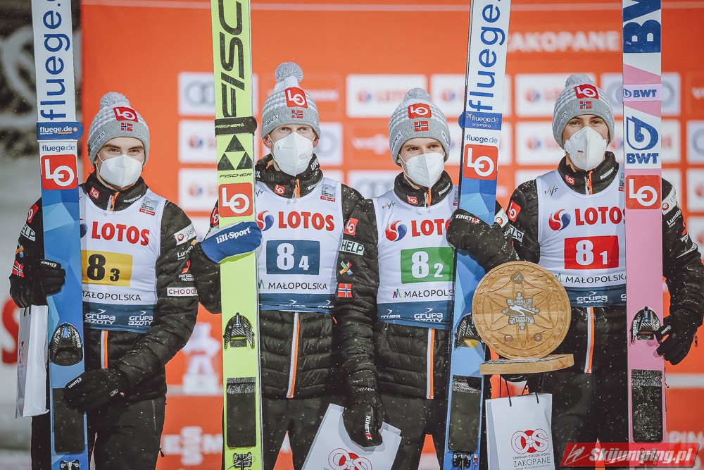 Po pierwszy drużynowy triumf w Zakopanem sięgnęli natomiast Austriacy. Michael Hayboeck (134 m), Jan Hoerl (133 m), Philipp Aschenwald (133 m) oraz Daniel Huber (135 m) pokonali Polaków o 8,9 punktu.