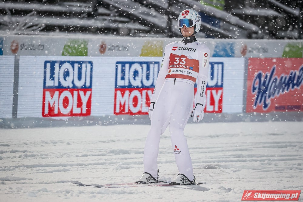 Po pierwszej serii na prowadzeniu znajdował się Stefan Kraft. Dwukrotny mistrz świata z Lahti poszybował na odległość 132,5 metra i wyprzedzał o 5,7 punktu Roberta Johanssona (129,5 m). Trzeci był Daniel Huber (133,5 m), czwarty Yukiya Sato (134 m), a piąty Piotr Żyła (130,5 m). Reprezentant Polski tracił 9,4 punktu do lidera oraz 3,3 pkt. do miejsca na podium.