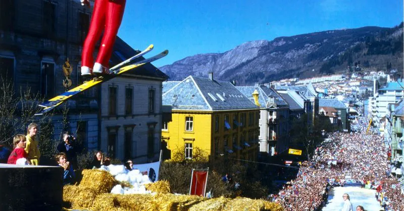 Choć igelit był już wówczas w powszechnym użyciu, to kłócił się z norweską tradycją skoków narciarskich. Nikt tu nie skąpił grosza, liczył się rozmach i końcowy efekt. Postanowiono, że zawody muszą zostać rozegrane na śniegu. Na wszelki wypadek przygotowano jednak duże ilości słomy, by wyłożyć nią zeskok w razie gdyby śnieg nie wytrzymał wysokiej temperatury. A ta przekraczała grubo 20 stopni. Biały puch dostarczono z odległej o około 130 kilometrów górskiej wioski Finse położonej na wysokości ponad 1200 metrów nad poziomem morza. Wieś jest trudno dostępna, nie posiada żadnej drogi dojazdowej, z resztą kraju jest skomunikowana tylko połączeniem kolejowym, stąd jedyną możliwością przetransportowania śniegu do Bergen było upychanie go do pociągów. Zainteresowanie niecodziennym wydarzeniem było ogromne. Według różnych szacunków zawody oglądało od 15 do nawet 30 tysięcy widzów ciasno stłoczonych na jednej z głównych ulic miasta. Śnieg topniał w oczach, ale jakimś cudem wytrzymał. Zwycięzcą konkursu został Roger Ruud, uzyskawszy odległość 21 metrów. Impreza z 2 maja 1986 roku w Norwegii nazywana jest najdziwniejszym konkursem w historii narciarstwa.