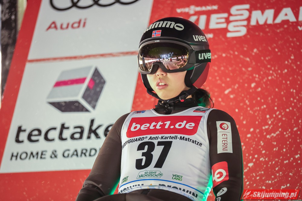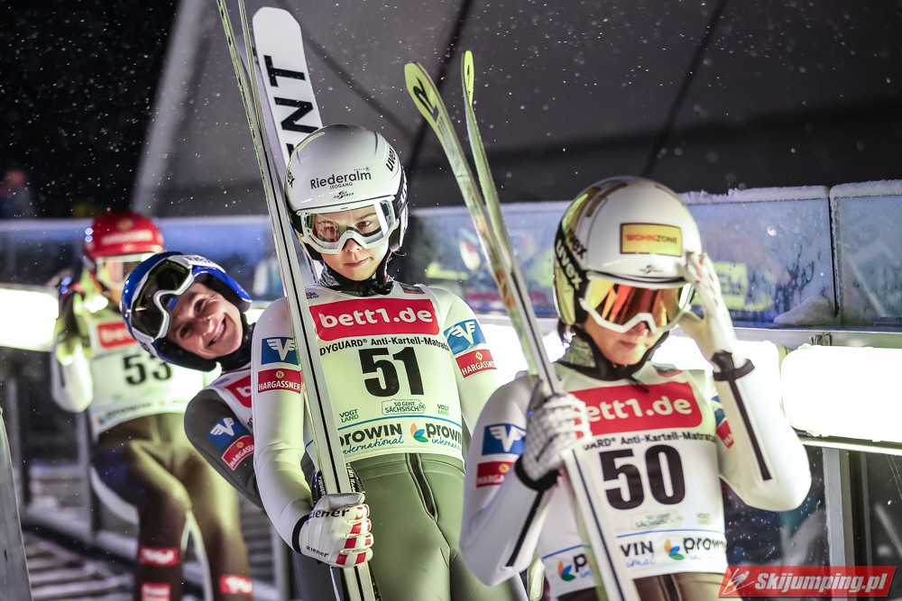 Czwartkowe kwalifikacje na Vogtland Arenie zakończyły się triumfem Marity Kramer. Liderka Pucharu Świata poszybowała na 140 metr i wygrała z przewagą 16,5 punktu nad Ursą Bogataj (132,5 m) oraz 17,6 pkt. nad Silje Opseth (139,5 m). Tuż za czołową trójką uplasowały się Nika Kriznar (132,5 m), Sara Takanashi (130 m) oraz Daniela Iraschko-Stolz (128,5 m).