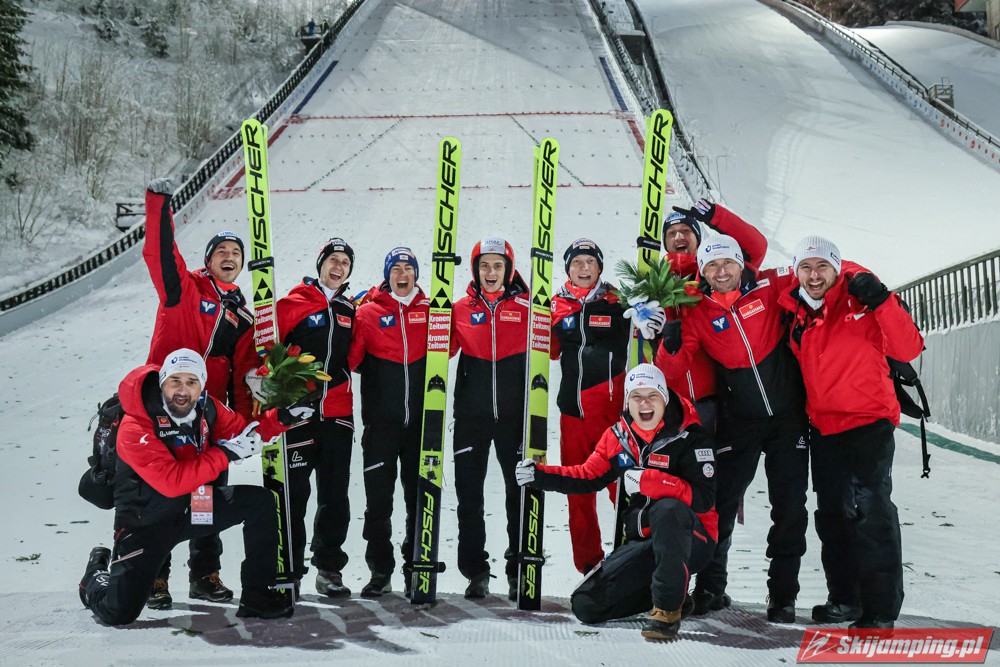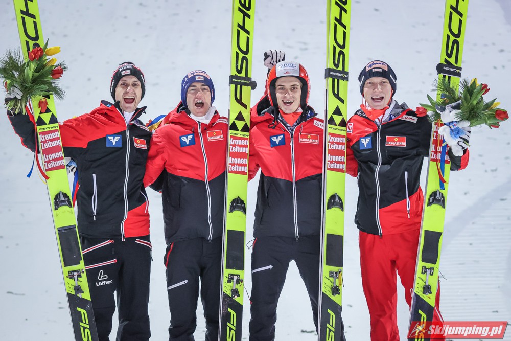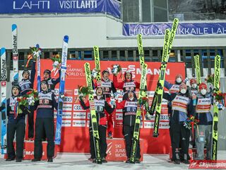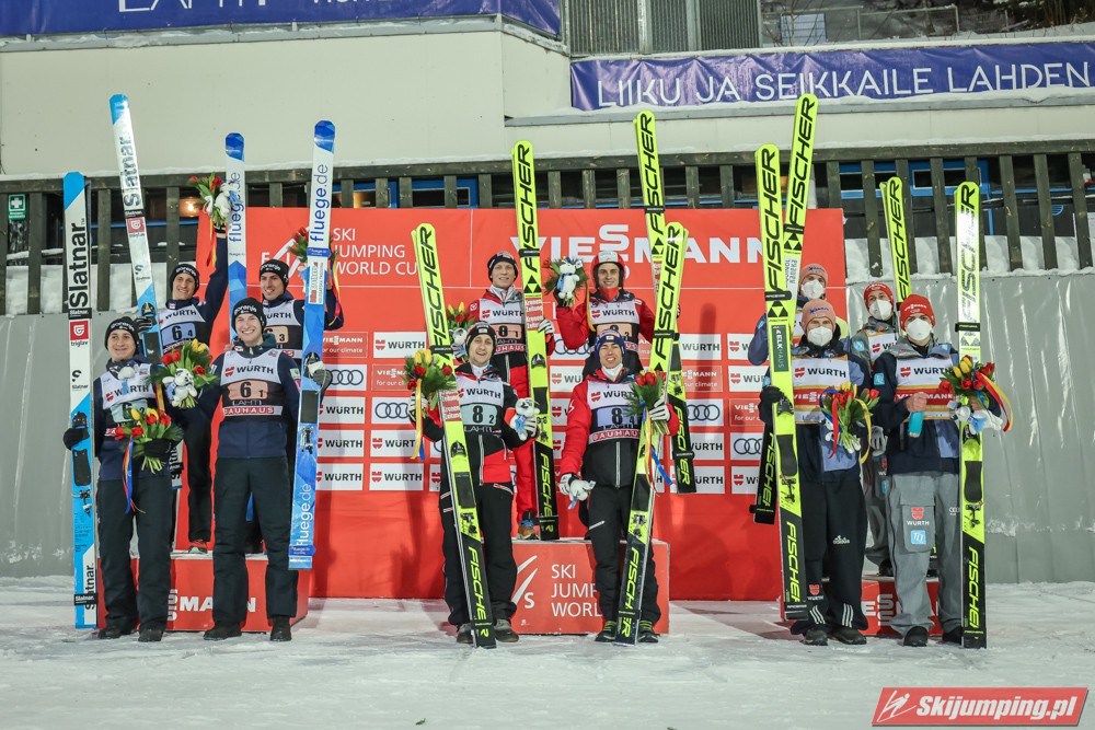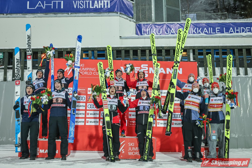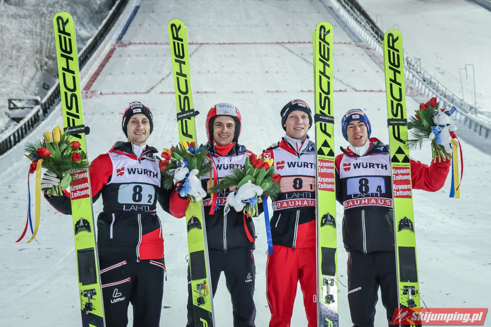 Reprezentacja Austrii wygrała sobotni konkurs drużynowy Pucharu Świata na Salpausselce (HS130) w Lahti. Świeżo upieczeni mistrzowie olimpijscy wyprzedzili zespoły Słowenii i Niemiec. Polacy po dyskwalifikacji Pawła Wąska w serii finałowej zajęli siódmą pozycję.