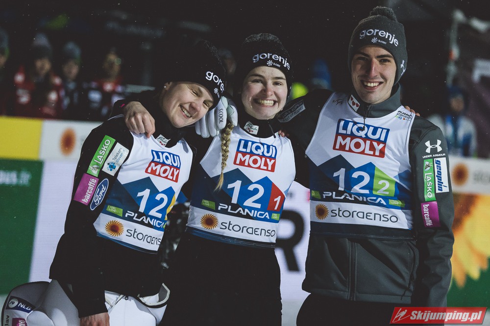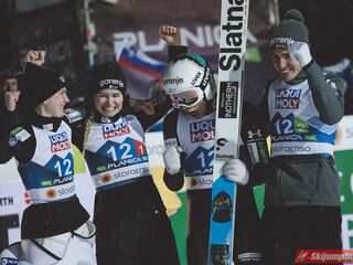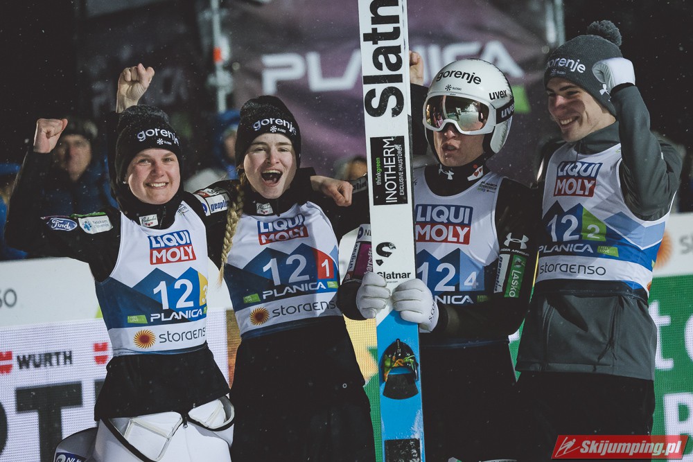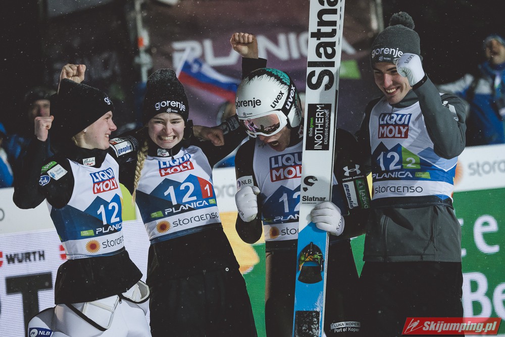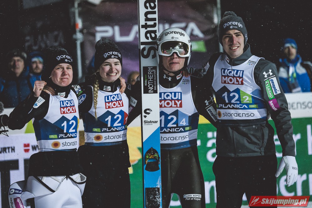 Huśtawkę nastrojów swoim kibicom zafundowała reprezentacja gospodarzy. Słowenia wyszła na prowadzenie w konkursie po próbie Niki Kriznar (101 m), zaś przewagę punktową powiększył Timi Zajc (103 m). Słaby skok Emy Klinec (91 m) i niskie noty za styl sprawiły jednak spadek ekipy na trzecią pozycję. Ostatecznie brązowe medale przypieczętował Anze Lanisek skokiem na 98 metr.