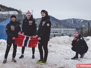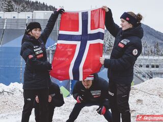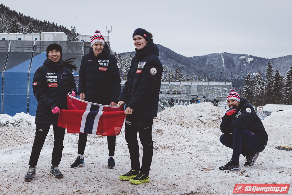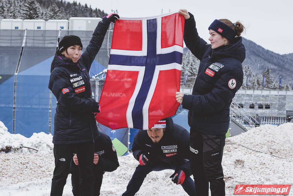 Liderzy na półmetku musieli zadowolić się drugim miejscem. Norwegia w składzie Anna Odine Stroem (91 m), Johann Andre Forfang (98 m), Thea Minyan Bjoerseth (99,5 m) oraz Halvor Egner Granerud (97,5 m) stracili do triumfatorów 12,7 punktu.