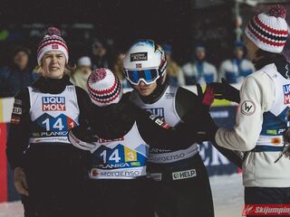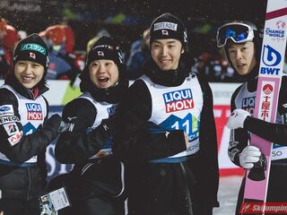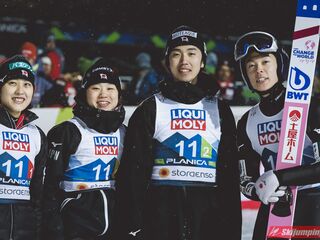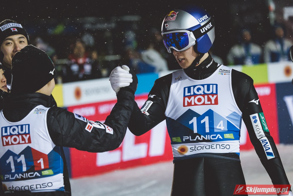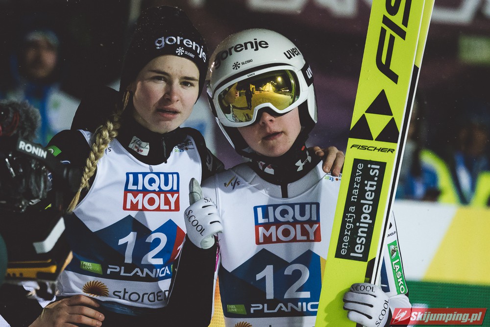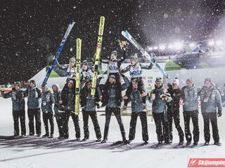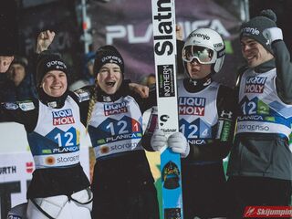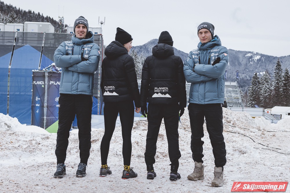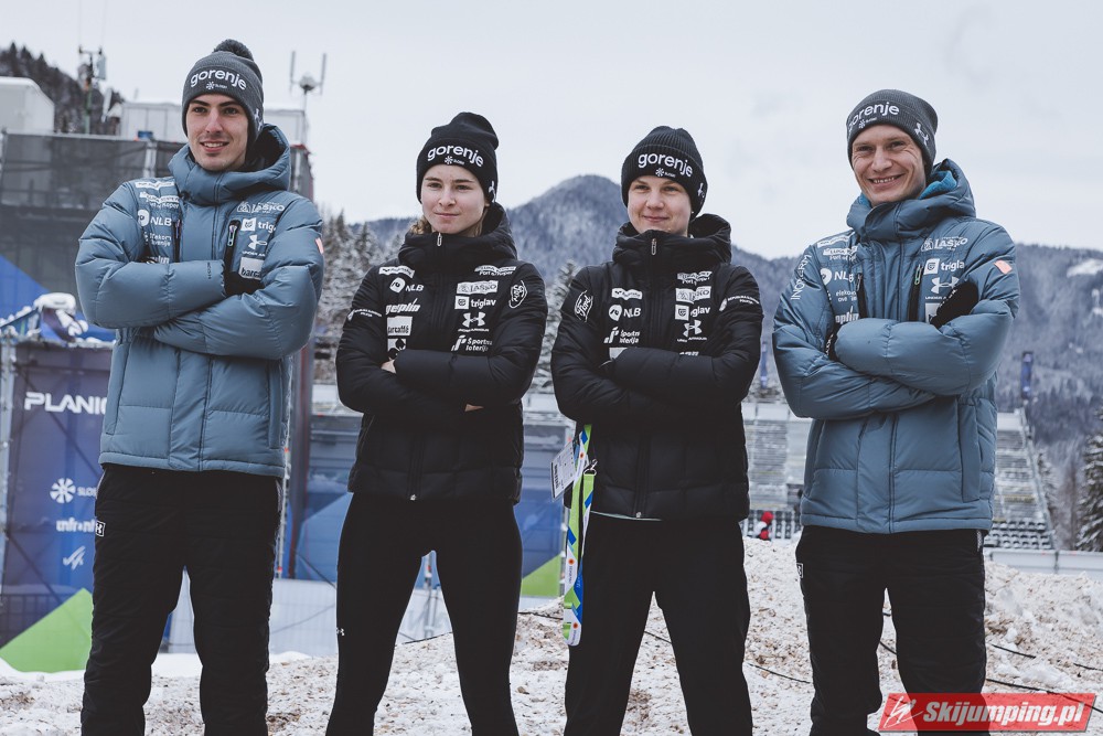 Trzecie miejsce na półmetku zajmowała Słowenia. Gospodarze mistrzostw w składzie Nika Kriznar (101 m), Timi Zajc (96,5 m), Ema Klinec (88 m) i Anze Lanisek (100 m) mieli jednak zaledwie 0,1 punktu straty do drugich Niemców.