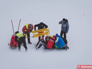 Groźnie wyglądający upadek na 70 metr zaliczył Peter Prevc. Zdobywca Kryształowej Kuli za sezon 2015/2016 opuścił zeskok Bloudkovej Velikanki na toboganie. Słoweniec jest przytomny, ale został zabrany do szpitala na dalsze badania.