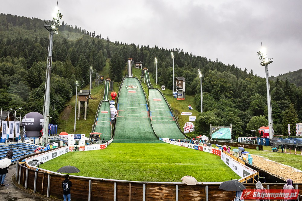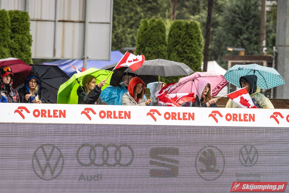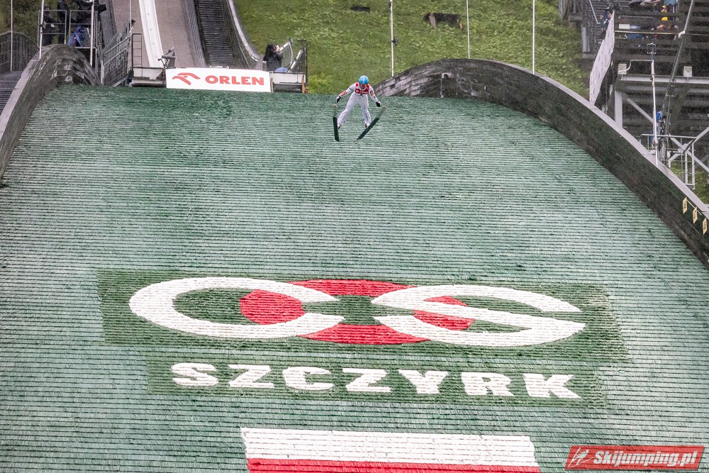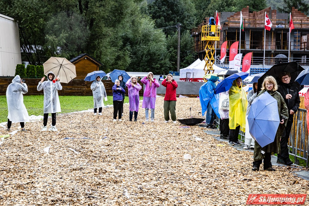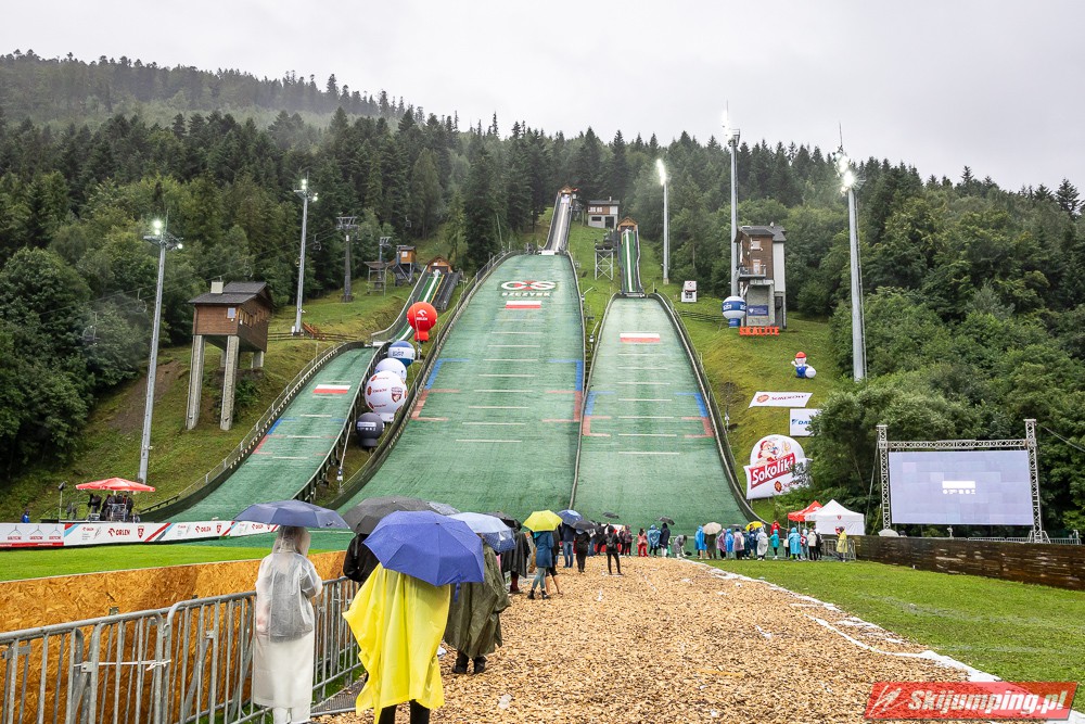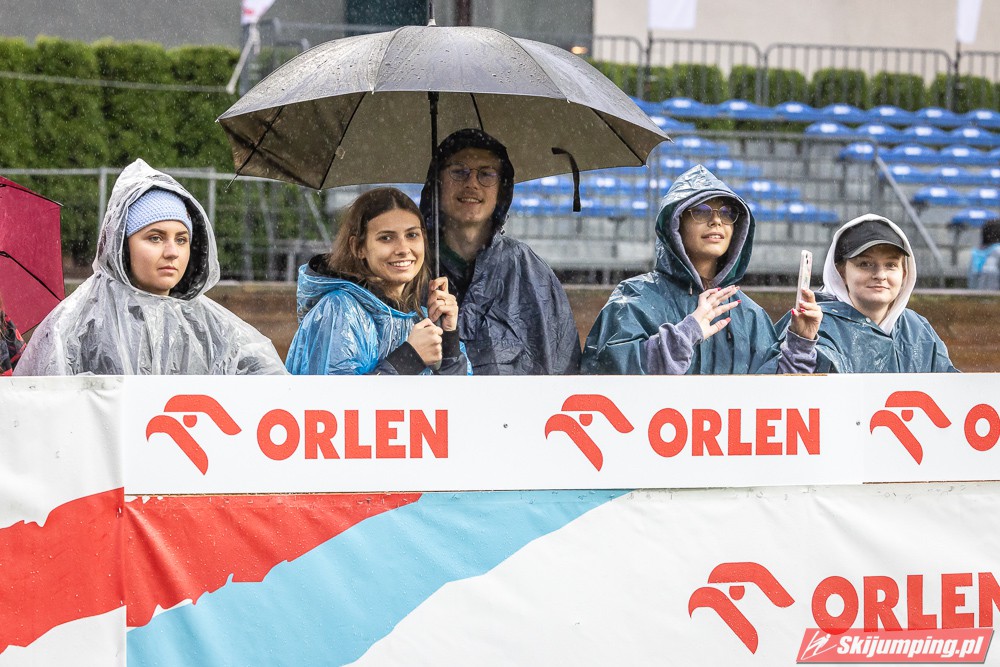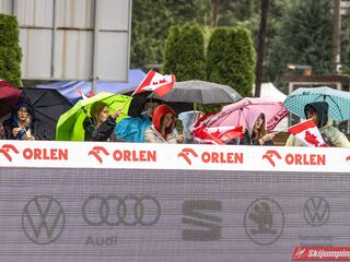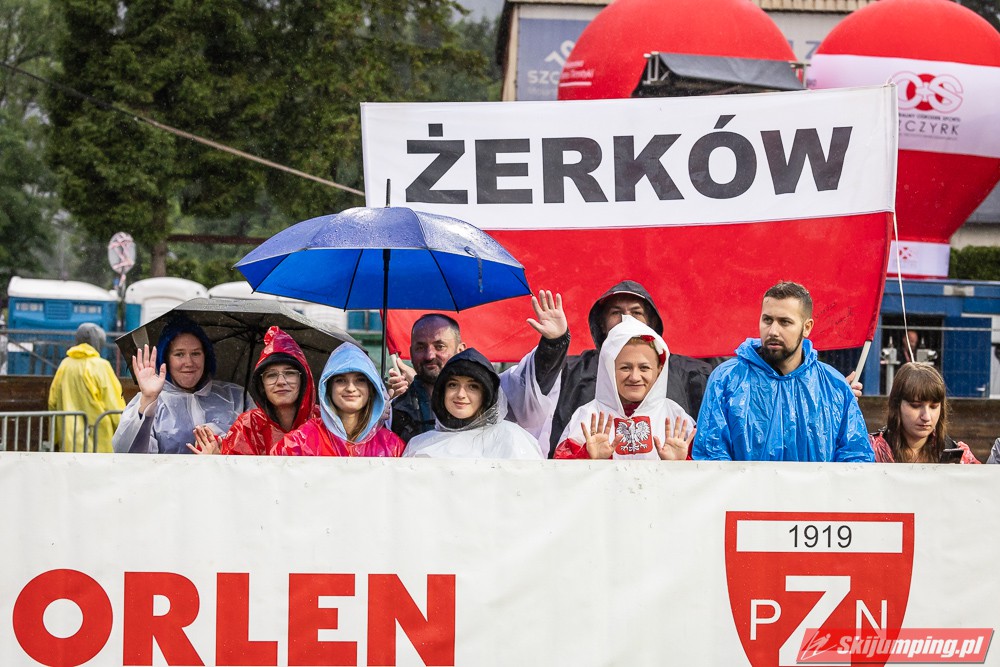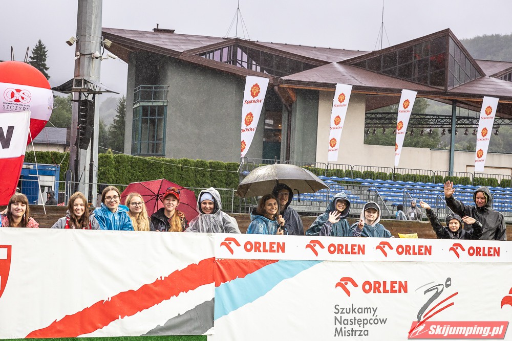 Widziałem wszystkie zawody i panów, i pań w Szczyrku, będąc obecnym na skoczni. O ile to, że dziś na konkurs kobiet zostali tylko najwytrwalsi, mnie nie dziwi, bo pogoda nie dopisała, ponadto odwołano serię próbną i drugą serię konkursową panów, o tyle wczoraj niska frekwencja na zawodach pań była dla mnie rozczarowaniem. Trzeba jednak napisać, że również na zawodach mężczyzn trybuny nie tylko nie były pełne, ale bardzo wiele im do zapełnienia brakowało. Czyżby wysokie ceny biletów zrobiły swoje? 250 złotych za miejsca siedzące wobec 60 złotych za miejsca stojące za weekend to duża różnica. A dziś i tak prawie wszyscy stali, mało kto chciał siedzieć w czasie takiej ulewy.