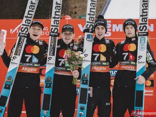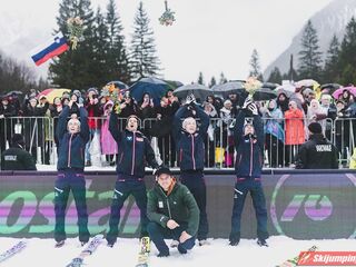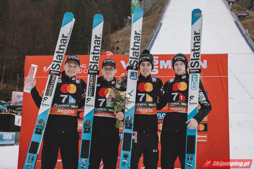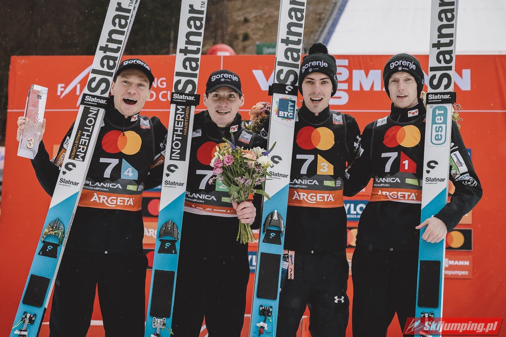 Faworyci do zwycięstwa, Słoweńcy, zamiast włączyć się do walki o wygraną, musieli bronić swojego miejsca na podium. Ostatecznie Lovro Kos (193 m), Domen Prevc (230,5 m), Timi Zajc (227,5 m) i Anze Lanisek (234,5 m) utrzymali trzecią pozycję.