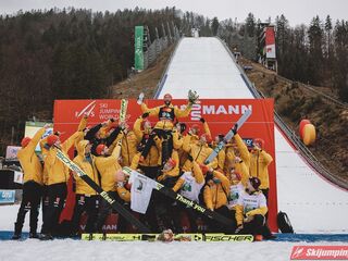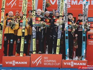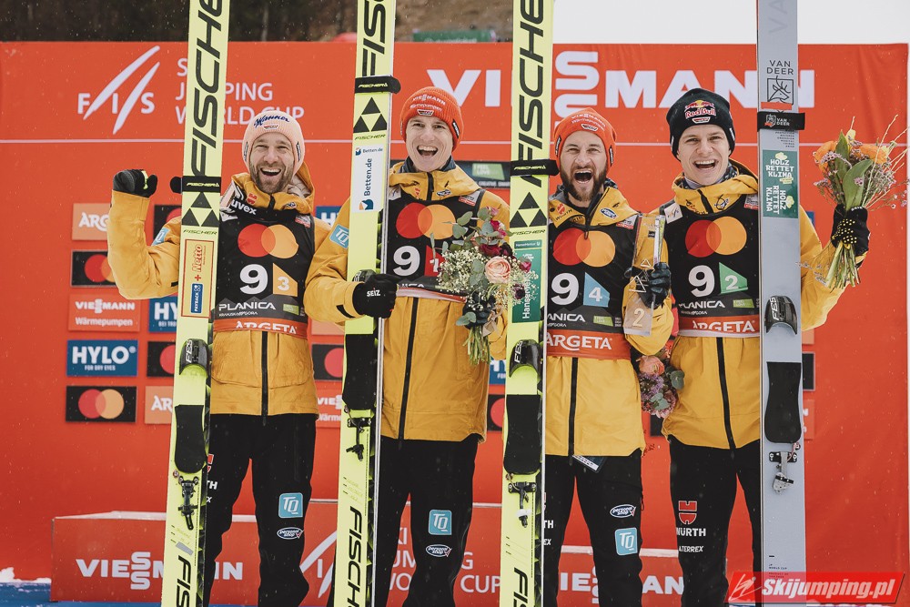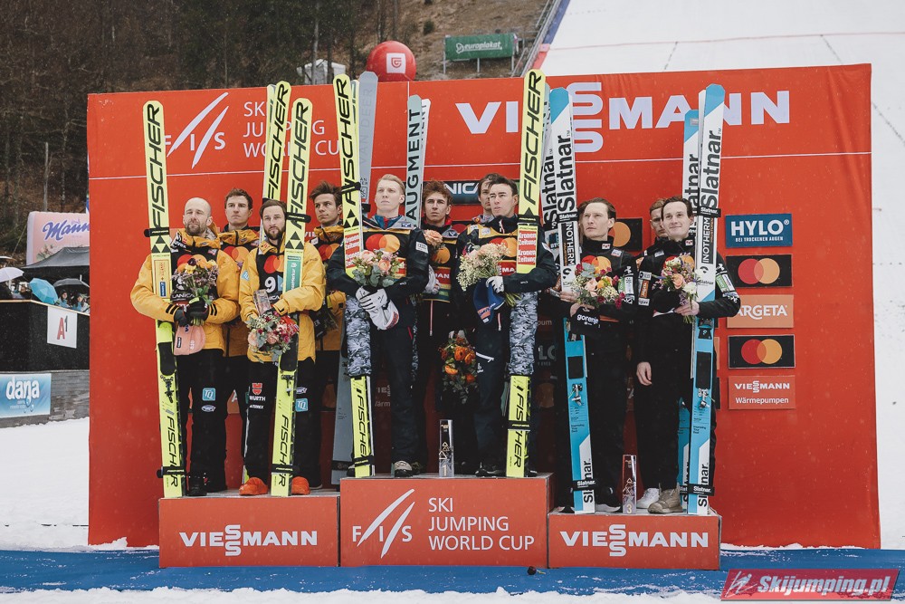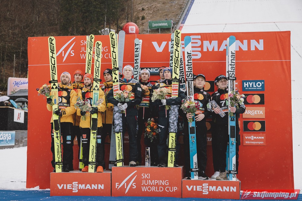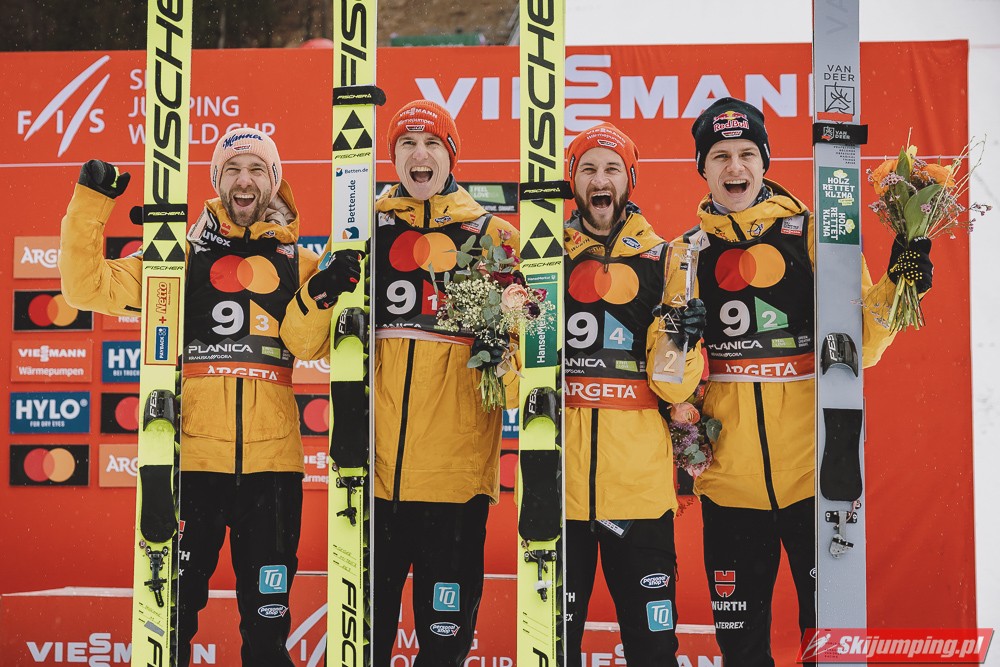 Drugie miejsce utrzymali Niemcy - Karl Geiger (226 m), Andreas Wellinger (227 m), Pius Paschke (215,5 m) i kończący karierę Markus Eisenbichler, którzy w ostatniej próbie poszybował na odległość 223,5 m. Podopieczni Stefana Horngachera stracili do zwycięzców 29,1 punktu.