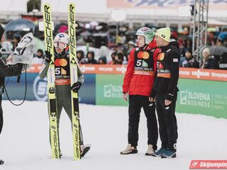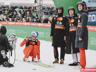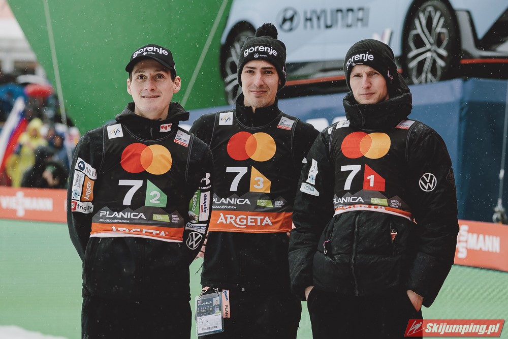 Na trzeciej pozycji sklasyfikowana była reprezentacja Słowenii. Lovro Kos (216,5 m), Domen Prevc (228 m), Timi Zajc (214,5 m) i Anze Lanisek (221,5 m) mieli stratę 25,8 punktu do liderów.